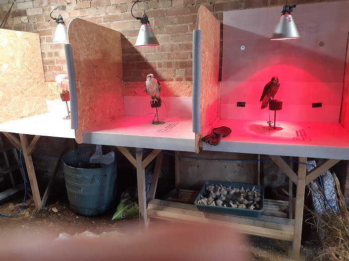 Daytime wet weathering's, for all our falconsIf wet or very cold, all under heat lamps, so they can be fed and cleaned out Note these have no sand in